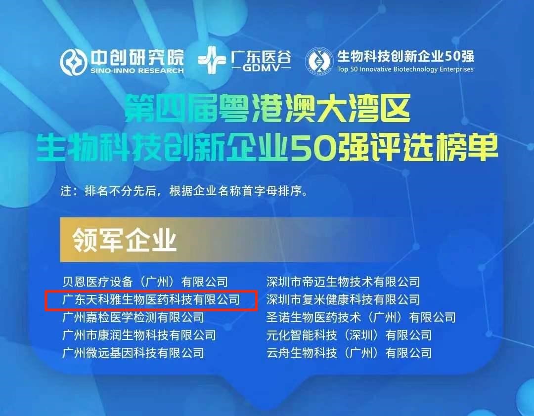 2021年12月29日,第四屆粵港澳大灣區(qū)生物科技創(chuàng)新企業(yè)50強頒獎典禮暨生物科技創(chuàng)新發(fā)展峰會將于廣州南沙舉辦,現(xiàn)場進行第四屆粵港澳大灣區(qū)生物科技創(chuàng)新企業(yè)50強頒獎典禮,天科雅榮獲“第四屆生物科技創(chuàng)新企業(yè)50強-領(lǐng)軍企業(yè)獎”。
