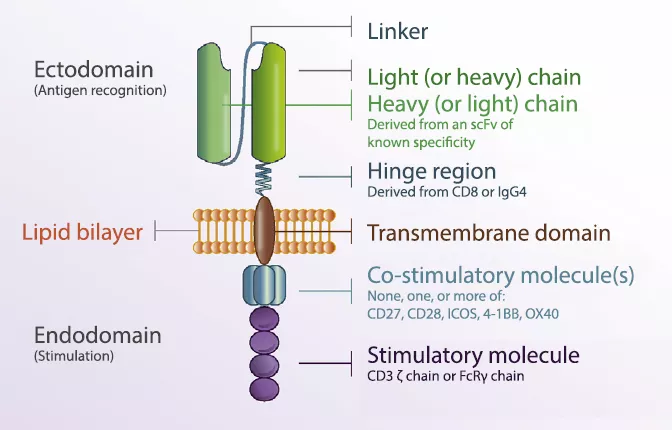 首先, 讓我們簡單回顧下CAR-T療法的作用機(jī)制, CAR(嵌合抗原受體)是一種基因工程技術(shù)制造的人工受體分子,它可以賦予免疫效應(yīng)細(xì)胞(如T淋巴細(xì)胞)針對某個靶點抗原表位的特異性,從而增強(qiáng)T淋巴細(xì)胞識別抗原信號與活化的功能,繼而回輸淋巴細(xì)胞以實現(xiàn)抗腫瘤的作用。