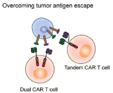 而所謂的多靶點CAR-T細(xì)胞,主要是設(shè)計用于靶向不同的腫瘤抗原,包括具有兩個CAR的雙CAR-T細(xì)胞或具有多個單鏈抗體(scFv)的串聯(lián)CAR-T細(xì)胞。這種多靶點CAR-T, 理論上能夠克服腫瘤抗原異質(zhì)性與腫瘤抗原逃逸