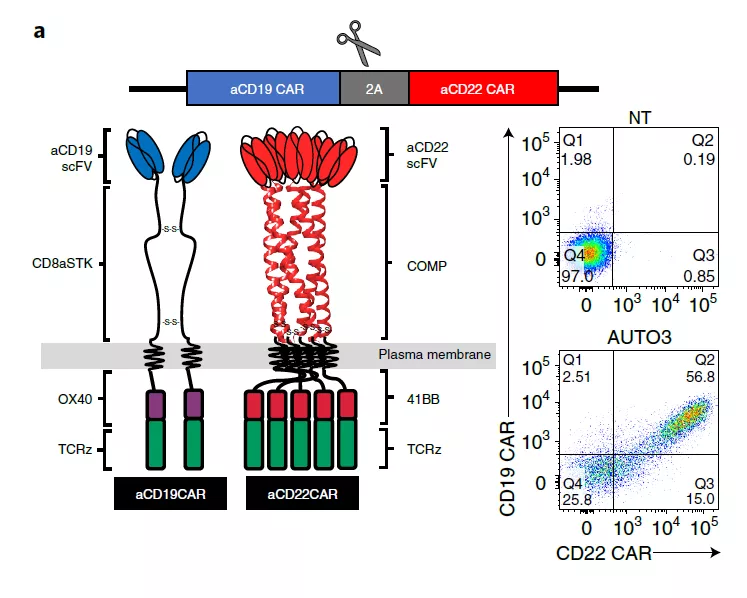 2021年10月12日,Nature Medicine期刊上公布了抗CD19和抗CD22 CAR的自體轉(zhuǎn)導(dǎo)T細(xì)胞(AUTO3)在復(fù)發(fā)性或難治性B-ALL(n=15)的兒童和年輕成年患者中的I期試驗,以評估AUTO3的療效。