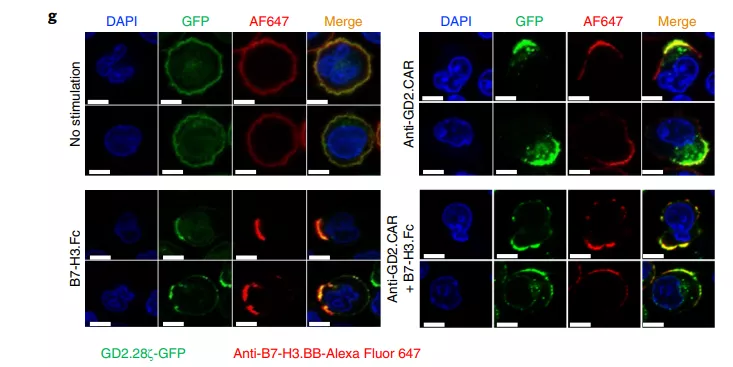 在共聚焦顯微鏡成像顯示CARs在表達(dá)GFP標(biāo)記的GD2.28ζ(綠色)和B7-H3.BB(紅色)的T細(xì)胞中聚集,能夠靶向神經(jīng)母細(xì)胞瘤細(xì)胞,并觀察殺傷效果。在隨后植入了神經(jīng)母細(xì)胞瘤的小鼠上,也驗證了雙靶向CAR-T細(xì)胞療法的優(yōu)異抗腫瘤結(jié)果。