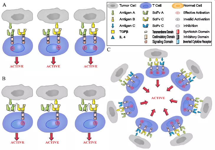 盡管多項研究數(shù)據(jù)顯示,多靶向CAR-T治療多種惡性腫瘤的療效顯示積極,成為預(yù)防抗原逃避的有效手段,但這種類型的CAR-T細(xì)胞可被多個靶抗原識別并高強(qiáng)度激活T細(xì)胞,容易引起細(xì)胞因子風(fēng)暴,并對低表達(dá)靶抗原的正常細(xì)胞過度殺傷。